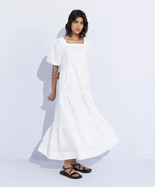 Tier dress with all over broderie anglaise. Square neck. Puffed sleeves with elasticated sleeve hem. Side pockets. Lined.
