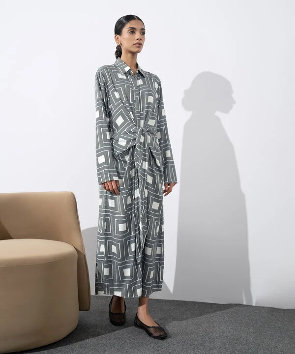 Printed button through dress in textured viscose fabric. Tie-knot detail. Collared neckline. Full sleeves. Side pockets.